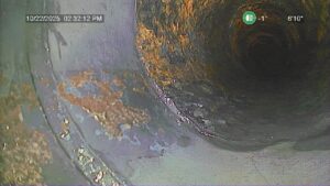 The inspection revealed a 5-foot section of cast iron pipe that was catching debris and restricting flow. This section, located under the footer and just outside the front of the home, had built up scale and sediment over time—common in older cast iron systems.